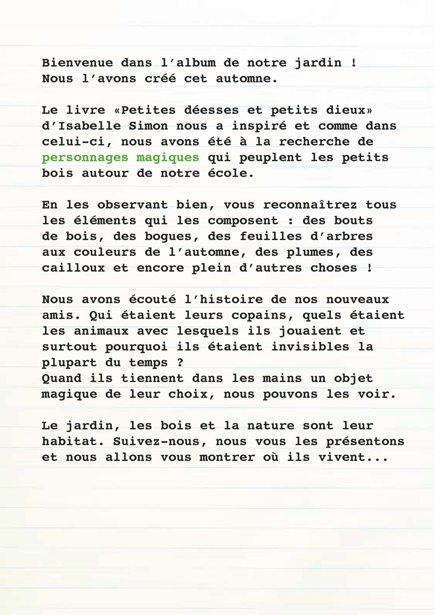 The book “Small goddesses and small gods” (Petites déesses et petits dieux) from Isabelle Simon inspired us and as in this one, we were in search of magic characters who populate forests around our school.