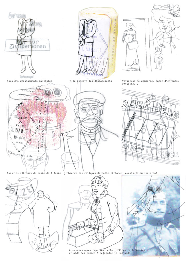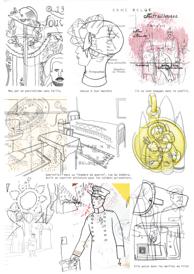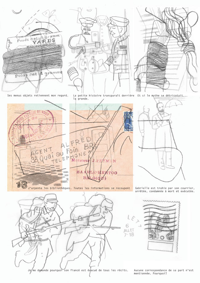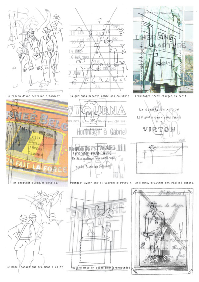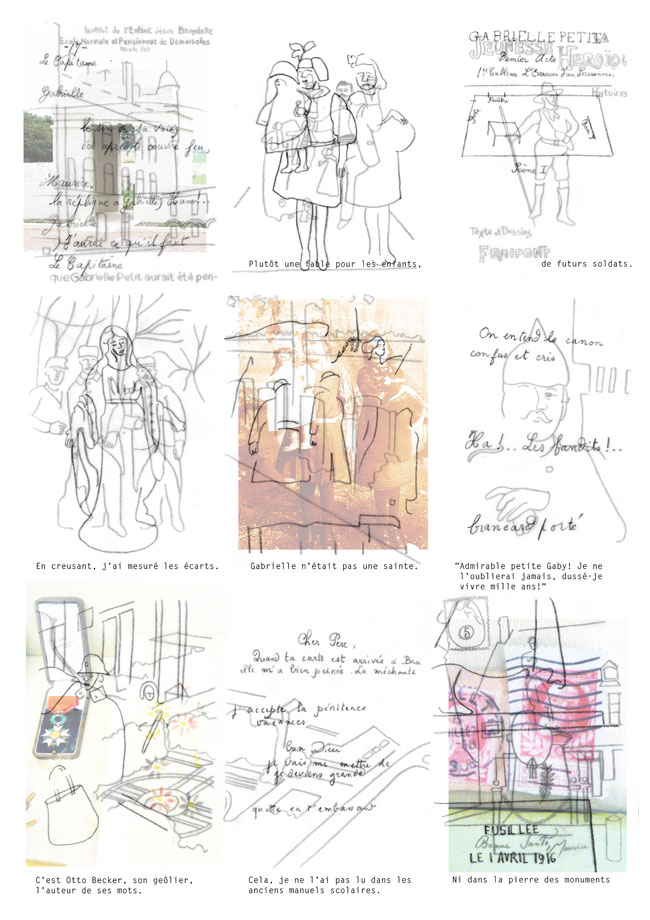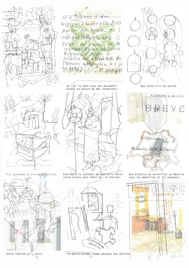 As my research progressed, I discovered the story of Gabrielle Petit, heroine of the Great War. Her glorified destiny and her personal story led me to understand how a myth is created. Work of cross-checking information and investigations at the scenes of her life made this project a reading in layers. The technique of overlaying drawings on tracing paper corresponds to this reflection.
