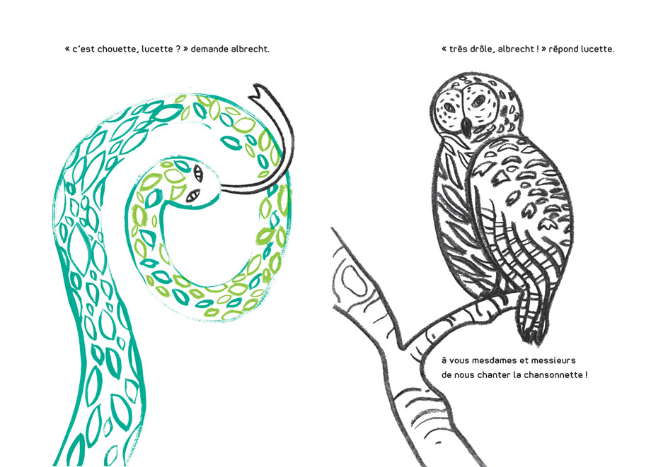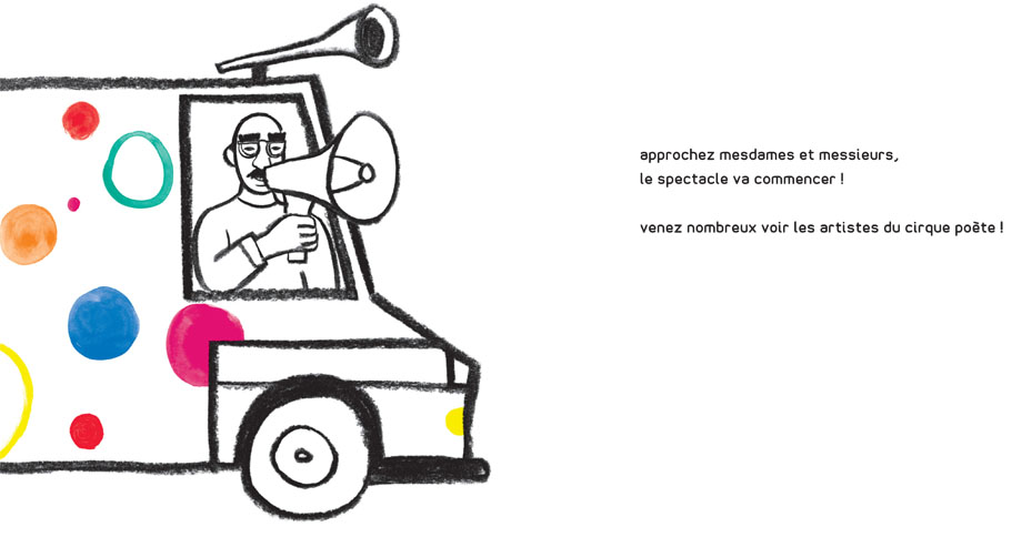 In the tone of a refrain, animals and characters of this book follow the underlying theme of the Poet Circus : the rhymes with “ette”. From the “chouette à la chaussette”, (owl to the sock) through the “majorette” (cheerleader), the drawings were inspired by the world of the circus and the fun fair of 1900. The story of this bizarre troupe is rendered by contrasting features of charcoal and pure paint colours.
