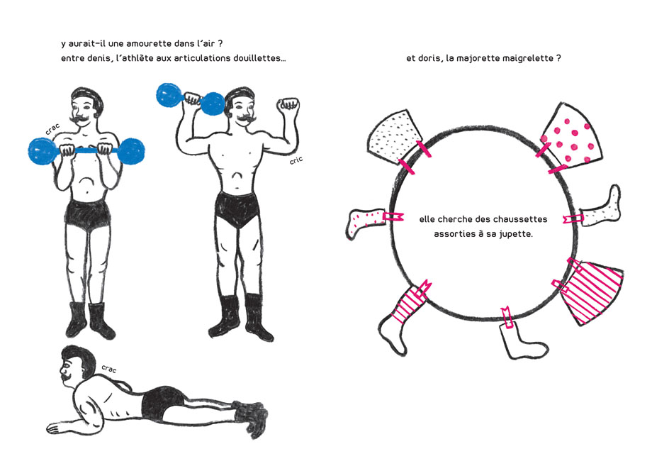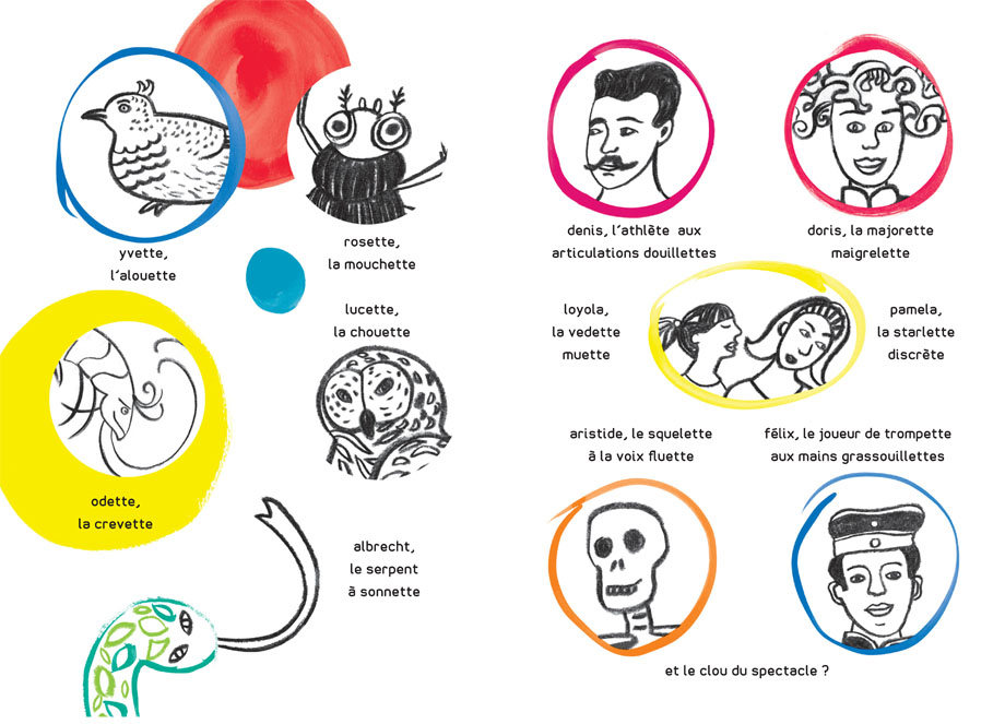 All of you come along to see the artists of the poet circus ! Odette the Shrimp, Lucette the Owl, Denis the Athlete, Doris the Cheerleader, and the mysterious Secret Silhouette, that will reappear at the end of the book. Maybe !