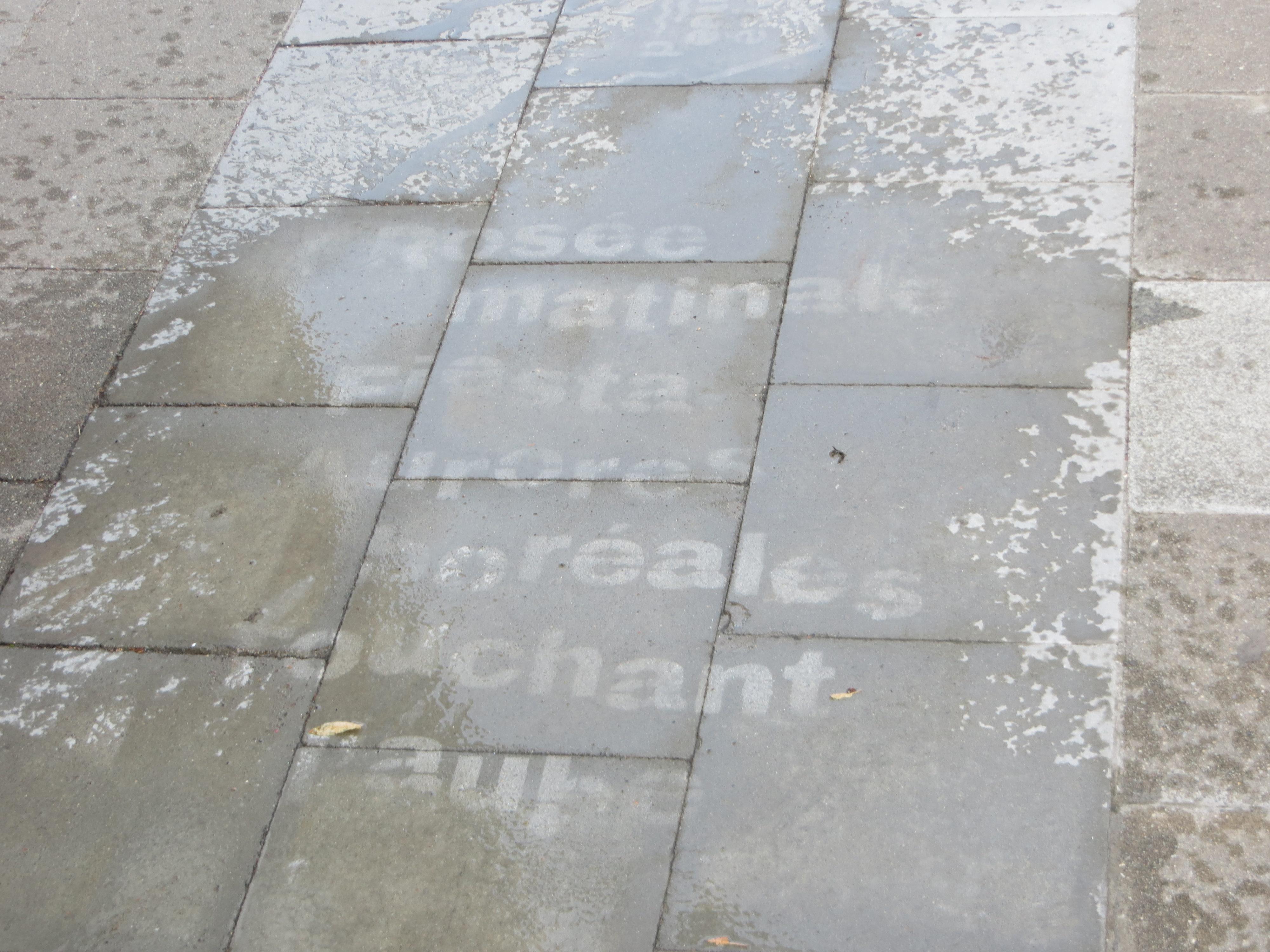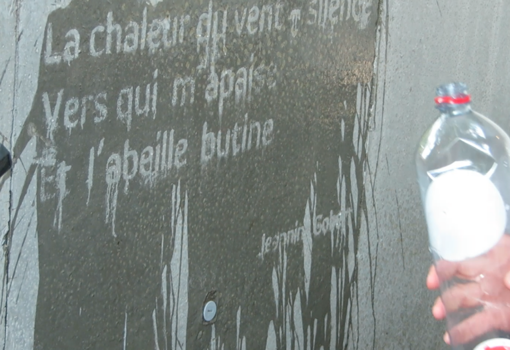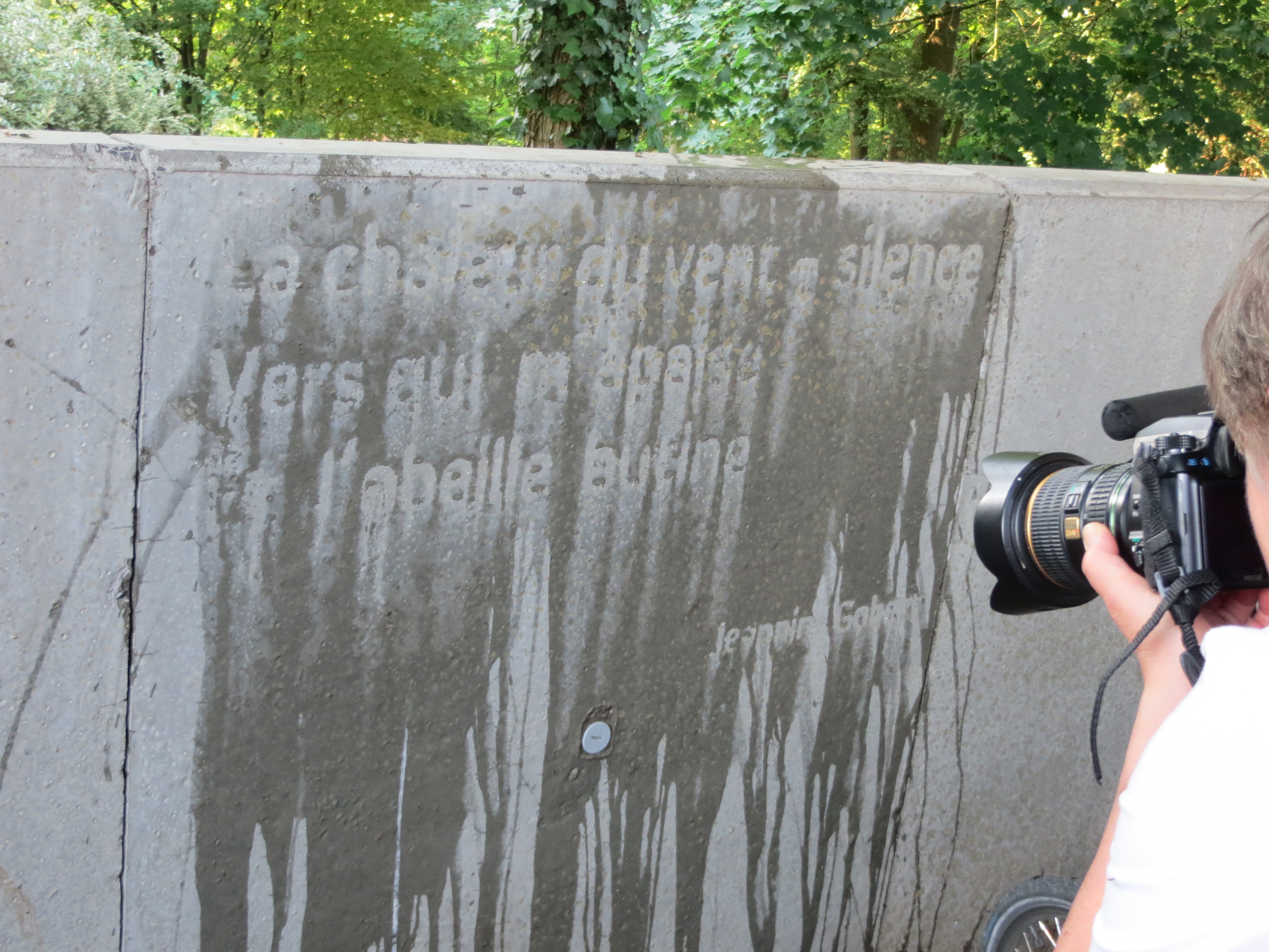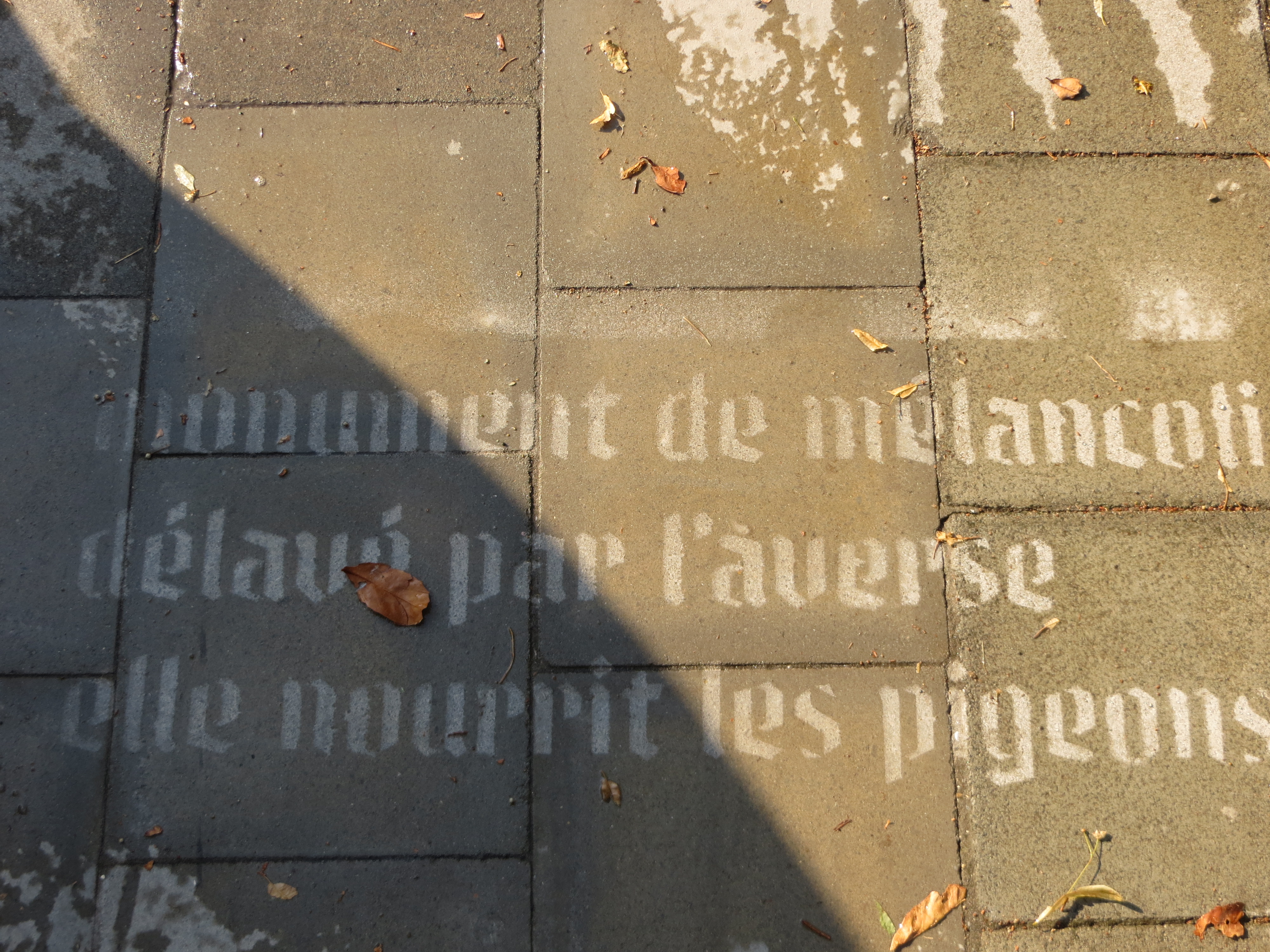 À l’aide d’un spray devenant visible uniquement au contact de l’eau, de pochoirs, et de pluie, une dizaine de poèmes ont été placés sur le territoire de Watermael-Boitsfort.
