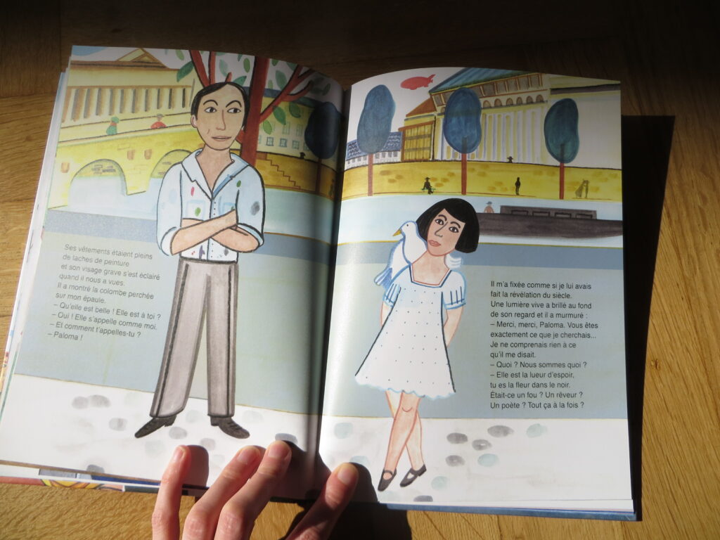Au cours de l’une de ses promenades dans les rues de Paris avec sa colombe, Paloma échange quelques mots avec un homme qui marque son esprit. Elle comprendra plus tard, face au tableau de Guernica, lors de sa visite à l’exposition universelle, qu’il s’agissait de Pablo Picasso.