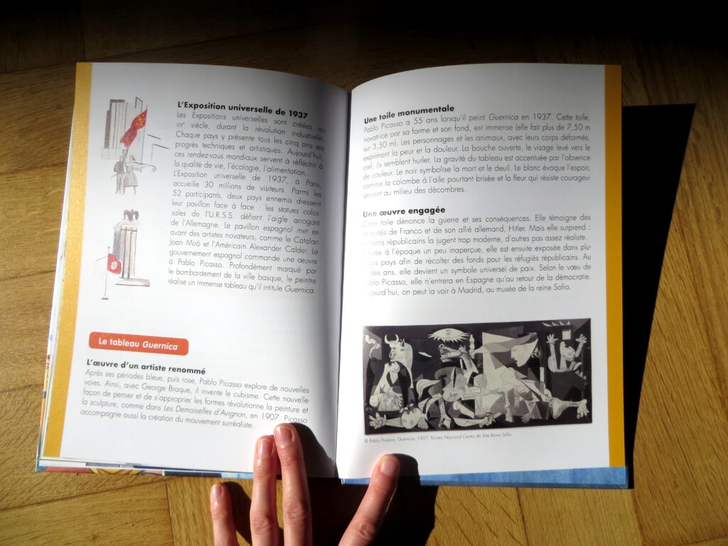 « Un jour ailleurs » : un album de fiction dans le contexte d’un événement marquant du XXe siècle suivi de 6 pages pour en savoir plus. La guerre civile en Espagne, l’exposition universelle, Pablo Picasso, le tableau de Guernica, l’Espagne aujourd’hui.